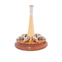 The set comprises a cocktail shaker in the form of a flared hunting trumpet in silver and silver gilt, its lid featuring a detachable cap and integral strainer. This is coupled with six hound head and one fox head stirrup cups on a mahogany stand, carved to enable the cups to rest horizontally or vertically.