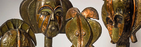 The extraordinary Kota figures are carved from wood and overlaid with brass and copper.