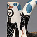 A Picasso ceramic jug is estimated to sell anywhere from $4,000 to $6,000. This ceramic jug depicts a man and horse in black, white, blue and brown glaze and the base is marked "Edition Picasso 216/300."