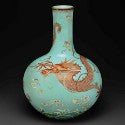 Hugely rare, the 20-inch high turquoise vase features a large five-clawed red dragon and a smaller pink dragon.