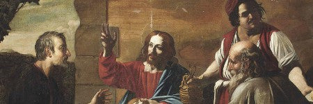 It shows the moment when Jesus, recently resurrected, reveals himself to two of his disciples in the town of Emmaus as told in the Gospel of Luke 24: 30-31.