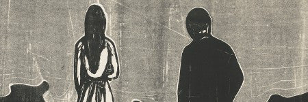 The woodcut shows two figures gazing out across a suitably bleak landscape, evoking Munch's pet themes of depression, ennui and existential terror.