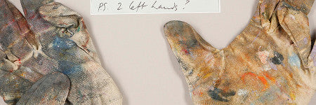 Bacon, who painted right-handed, wiped his brushes on the two left-handed gloves while producing Three Studies for a Portrait of Lucian Freud in 1969. The colours on the gloves match the artwork exactly.