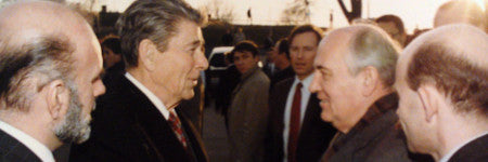 Mikhail Gorbachev and Ronald Reagan shake hands at a meeting in 1988