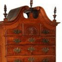 The Massachusetts maple highboy dresser features a swan neck pediment, alongside flame twist finials, and a fan-carved top centre drawer.