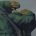 Dating to 1928, the painting is a significant contribution to Magritte's work, and has been exhibited widely. It depicts the titular hunters in paroxysms of terror, while apparently being swallowed by a wall.
