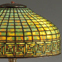 Of two Tiffany Studios Greek Key table lamps, an example featuring a background of mottled green and yellow panels that come to life with a turn of a knob sold on target for its $35,000-45,000 estimate at $37,950.