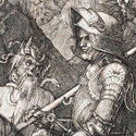 Dürer's 'The Knight, Death and the Devil,' of 1513 is one of his most celebrated and intricately conceived engravings. It depicts a Christian knight riding resolutely through a bleak, hostile landscape menaced by the figures of death on his traditional pale horse and the devil with a pig's snout.