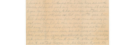It reads in part: "Well Sonny keep up your chin, and don't worry about your dear Dad, and when again you allowed a vacation, I want you and your dear Mother to come here together, as I sure would love to see you and Maggie…