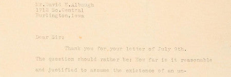 It's addressed to David H Albaugh, a student in Burlington, Iowa, who wrote asking whether Einstein had resolved "the question of the existence of God in the perceivable universe".