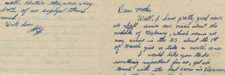 He writes [sic]: "Well, I have pretty good news we shall receive our visa's about the middle of February, which means we may arrive in the U.S. about the 1st of March give or take a month or so…