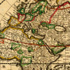 This example, Nova Orbis Tabula, In Lucem Edita, was drawn up in 1670, and includes four vignettes referencing the seasons, the zodiac, and the elements to accompany the lovingly drawn map. For example, the top right vignette represents Autumn, with the shore in the background illustrating the element Water.