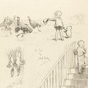 Comprising an image of Pooh bear loitering outside a butcher's shop, a drawing of Christopher Robin and Winnie-the-Pooh heading up stairs together, and a sketch depicting Pooh and Christopher Robin shooing away a flock of menacing geese - all on a single sheet, the illustrations are as charming as they are valuable.