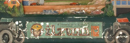 The sign is an automated diorama, showing motorised teens-era road and racing cars that move about the display. Valued at $25,000-30,000, it is in tatty condition with some loss of paint, but is nonetheless a charming piece of memorabilia.