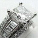 As pictured, the diamond is held by a set of milgrain prongs, and surrounded by 1.38ctw baguette diamonds in a "triple split design." The ring is finger size 6.5.