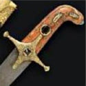 This nobleman's sword has a 14 karat gold crossguard chased with a leafy meander framed by niello panels, and is set on the front and back with large tourmalines (complex crystals which produce polarised light).