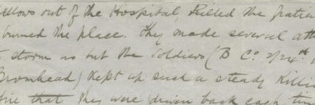 "They drove our fellows out of the hospital, killed the patients and burned the place. They made several attempts to storm us but the soldiers (B Co of 24th under Bromhead) kept up such a steady killing fire that they were driven back each time.