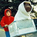 During the unforgettable scene, ET, bundled up in a blanket in the basket of Elliot's bicycle, causes Elliot and his friend's bicycles to levitate through the air, past the setting sun to safety.