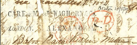 Valued at $10,403 the lot is one of nine known specimens to display the "CARE OF MESSRS WAGHORN & CO / LONDON ALEXANDRIA" handstamp.