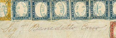 It displays six 1855 Sardinian 20c stamps, along with an 1855 40c and an 1858 80c. All display strong margins and excellent colour.