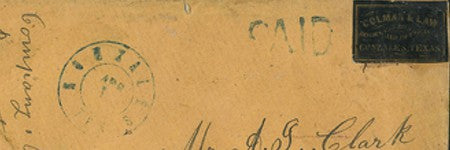 An 1865 Gonzales, Texas 10c gold on black cover made $47,500 in a sale of postmaster's provisionals at Robert A Siegel in New York on June 24.