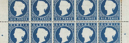 A sheet of 15 1880-1881 Gambia 6d waterproof crown stamps was among the highlights of the Philatelic Collector's Series sale at Spink London on June 26.