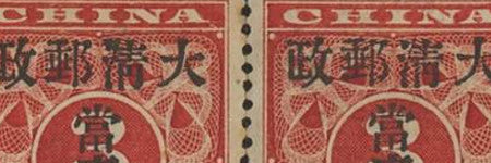 A Chinese 1897 revenue surcharge small $1 pair is up for auction at Spink Hong Kong.