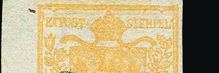 An 1850 Lombardy & Venetia 30c pale brown block of four with wide margins, cancelled by manuscript crosses, is selling for £26,700 ($41,705). It is one of just three blocks from the issue recorded.