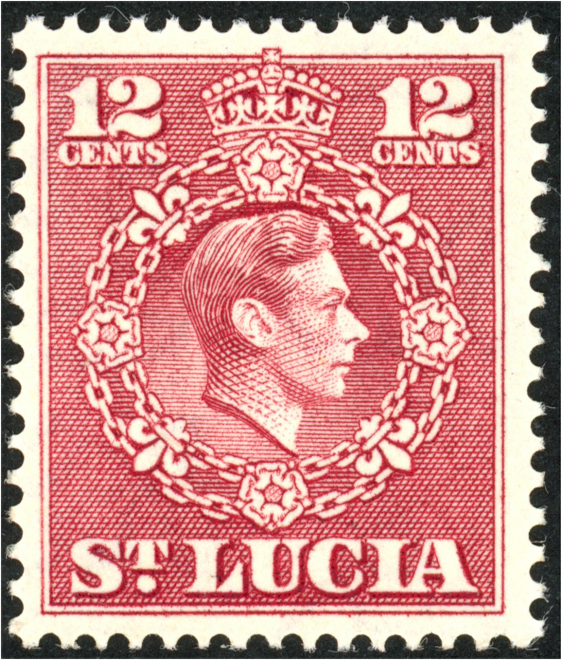 Saint Lucia 1949-50 12c claret, perforations 14½x14, SG153a.