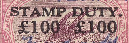 A Papua 1930s-52 "STAMP DUTY / £100 £100" overprint with cancellation is the headline lot of Status International's August 21 online sale.