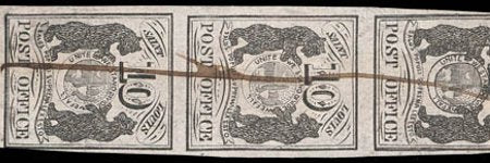 A strip of three 1846 10c St Louis Bear stamps has provided a highlight of Schuyler Rumsey Philatelic Auctions' recent online sale.