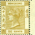 The 96c olive-bistre had a very short life. It was issued at the Post Office around January or February 1865. A new printing, in the correct brownish grey shade, was made at the same time and these supplies of these were available in Hong Kong around late July or August 1865.