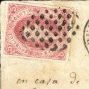 It combines an 1867 Rivadavia (imperforate and un-watermarked) with a 5c rose red, 10c green and 15c blue. The first two boast large margins all around, whilst the last one has a small cut and nick at bottom, cancelled by an oval of dots in black.