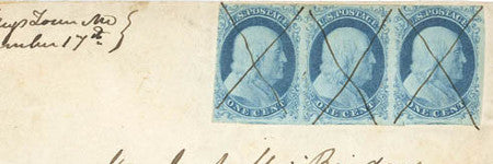 A cover displaying a strip of three US 1851 1c blues carries an estimate of $40,000-60,000 ahead of a major stamp sale at Daniel Kelleher.