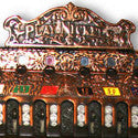 From the same general timeframe as the mechanical music machines, a Caille upright 5-cent slot machine is richly decorative, with a copper marquee, front plates, paw feet and additional trim to its handsome oak body.