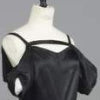 The long black silk dress, from 31 Rue Cambon Paris Biarritz, features a unique neckline and puffed sleeves hanging halfway down on the shoulder.
