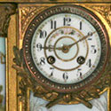 An array of fancy French clocks features 18th and 19th century designs, including gilt bronze figural, tortoiseshell, dore bronze, inlaid marquetry, bronze and porcelain; and elegant champleve designs, as well as many three-piece clock and garniture sets.