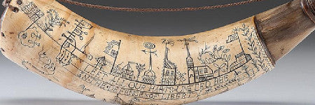 The horn was engraved by Barnabas Webb, a private in the Continental Army. Before the war he had trained as a silversmith, hence the extraordinary complexity of this carving.