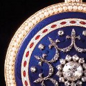 Another is a fine George III gold enamel and diamond-set watch made for the Chinese market signed William Anthony London no. 1751. The exterior of the case is set with a central rose-cut diamond within a border of diamond-set leaves with diamonds between on a damascened blue enamel ground.