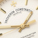 This is an 18ct gold automatic gentleman's Overseas bracelet watch circa 1996. The silvered circular dial has gilt hour markers and a date aperture at three o'clock. A Maltese cross is displayed at twelve o'clock.