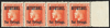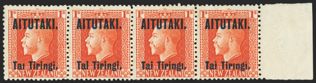 Cook Islands - Aitutaki 1916-17 King George V 1s vermilion, type 8 surcharge, perforations 14x14½, right marginal horizontal strip of 4 from R8/9-12, showing the three different 'No dot on i' varieties on R8/9 (SG 14ab), R8/11 (SG 14ad) and R8/12 (SG 14ac) se-tenant with a normal (R8/10), SG14a/ab/d.