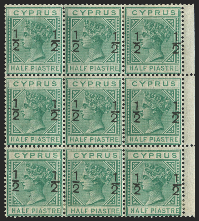 Cyprus 1882 "½" on ½pi emerald-green, type 8 litho surcharge, watermark CA, right marginal BLOCK OF NINE showing repetition of types 4-6 of the setting, SG25.