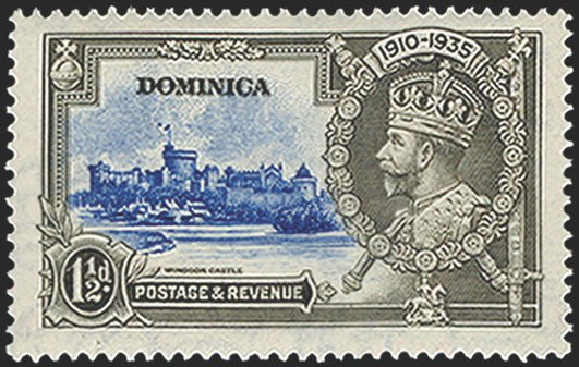 Dominica 1935 Silver Jubilee 11/2d ultramarine and grey, variety 'Dot by flagstaff' from vignette plate '4', R8/4, SG93h.