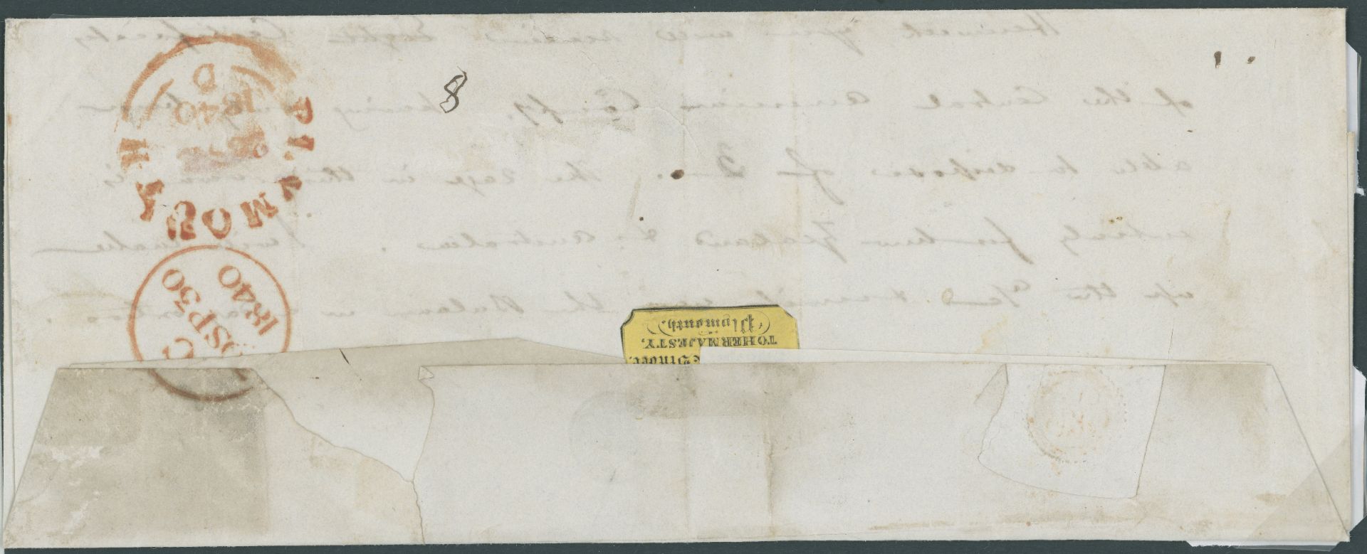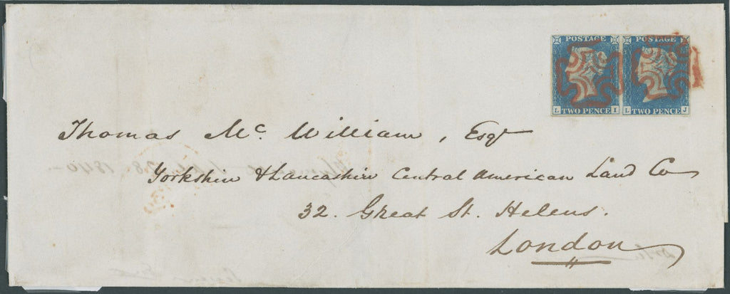 A superb used four margin horizontal pair lettered 'LI-LJ', beautifully tied to a clean fresh cover by crisp red Maltese Crosses. Sent from Plymouth to London and backstamped accordingly for 'SP.28-30. 1840'.