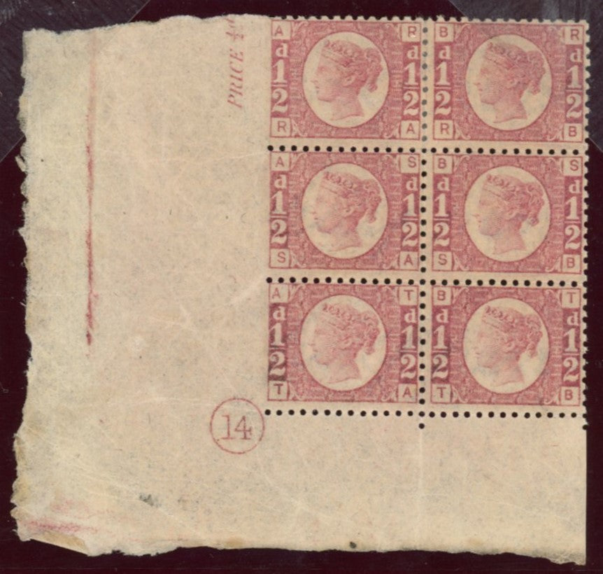 A very fine unused, with original gum, bottom left hand corner marginal block of six lettered 'RA-TB' (bottom four stamps are unmounted mint). Showing full deckle edge selvedge, plate number "14" and imperforate to left hand sheet margin.