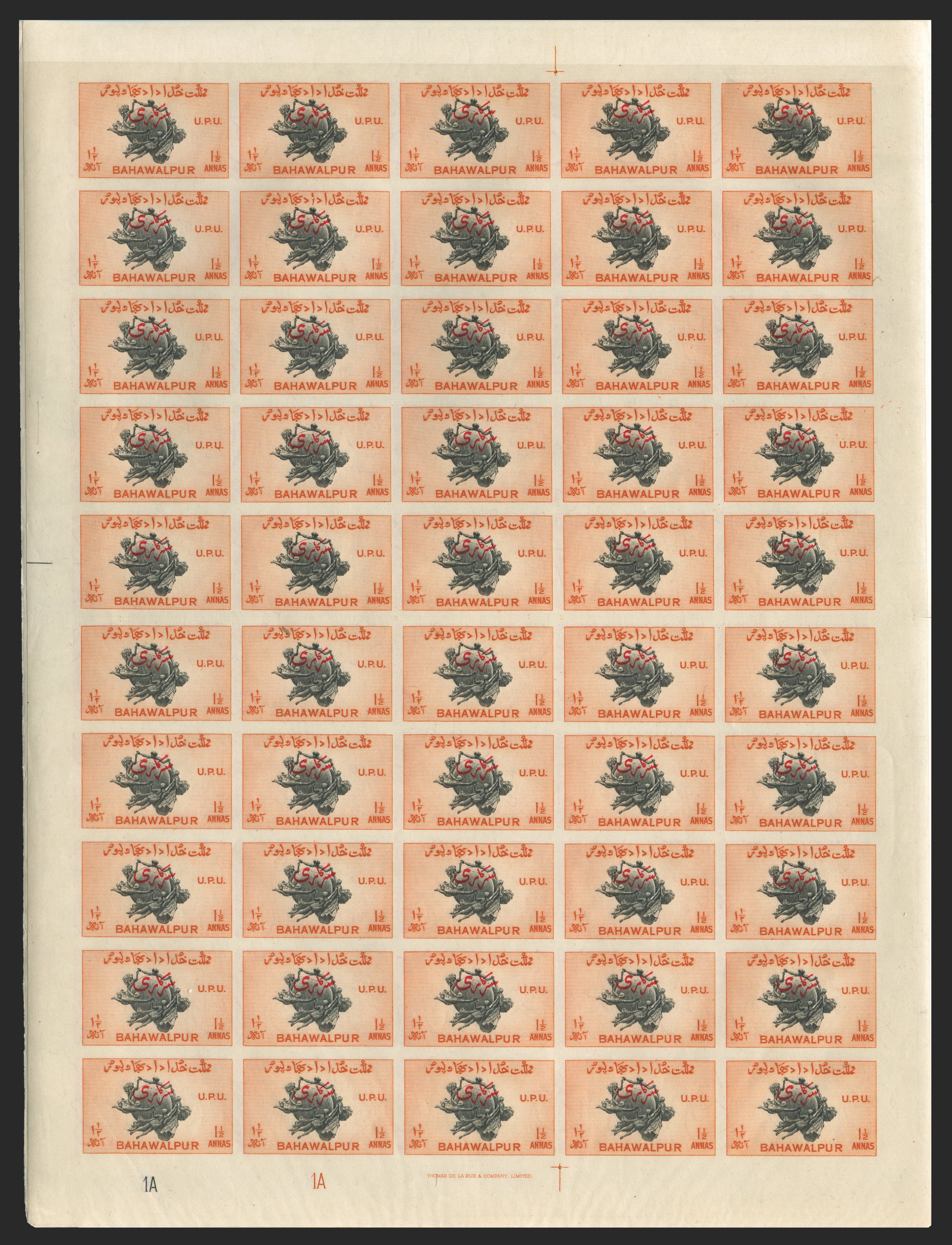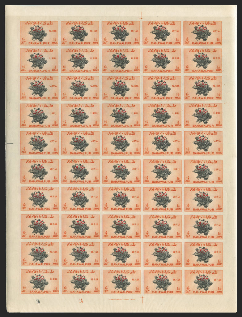 Pakistan Bahawalpur 1949 Anniversary of Universal Postal Union set of 4 to 2½a Officials, in complete IMPERFORATE sheets of 50 (5x10), each with plate numbers '1A 1A' (except 1a '1B 1B') and imprint at foot, SGO28/31.