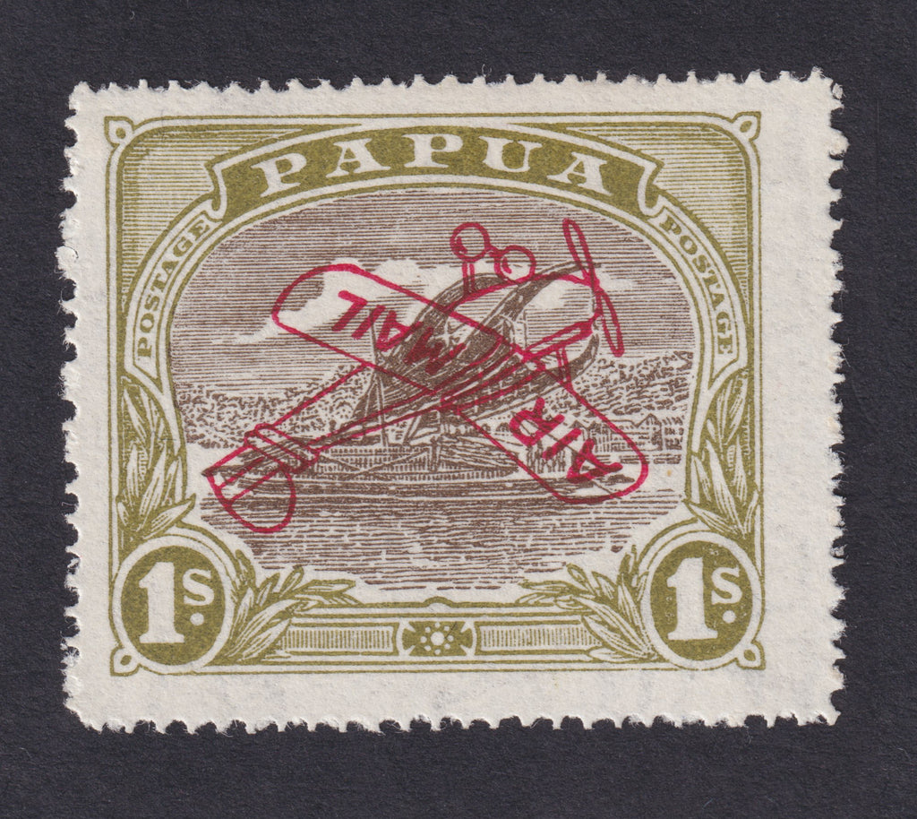 Papua 1930 (15 Sep) 1s sepia and olive, "AIR MAIL" Harrison printing, type 11 overprint in carmine, ERROR OVERPRINT INVERTED, SG117a.