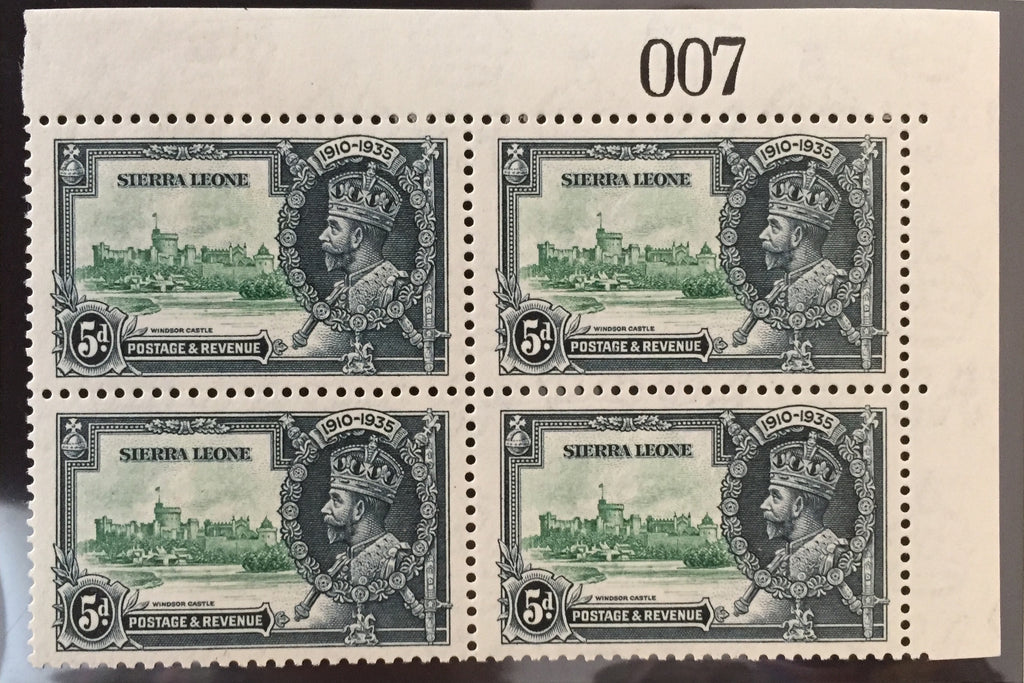 Sierra Leone 1935 5d green and indigo Silver Jubilee, upper right corner block of 4 with sheet number '007' from vignette plate '3', showing printing variety 'Lightning conductor' on R2/5, SG183/c.