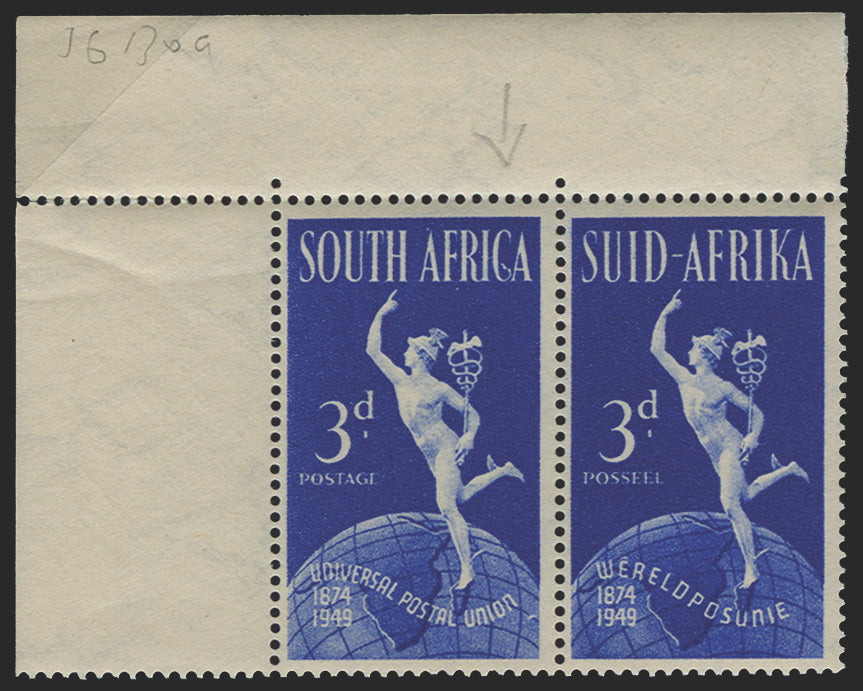 South Africa 1949 75th Anniversary of the Universal Postal Union 3d bright blue, upper left corner horizontal pair, left stamp (R1/1) showing variety 'Serif on C', SG130a.