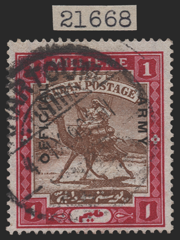 Sudan 1905 1m brown and carmine Army Service, type A2 (small) overprint, with "ARMY" reading downwards, SGA3b.